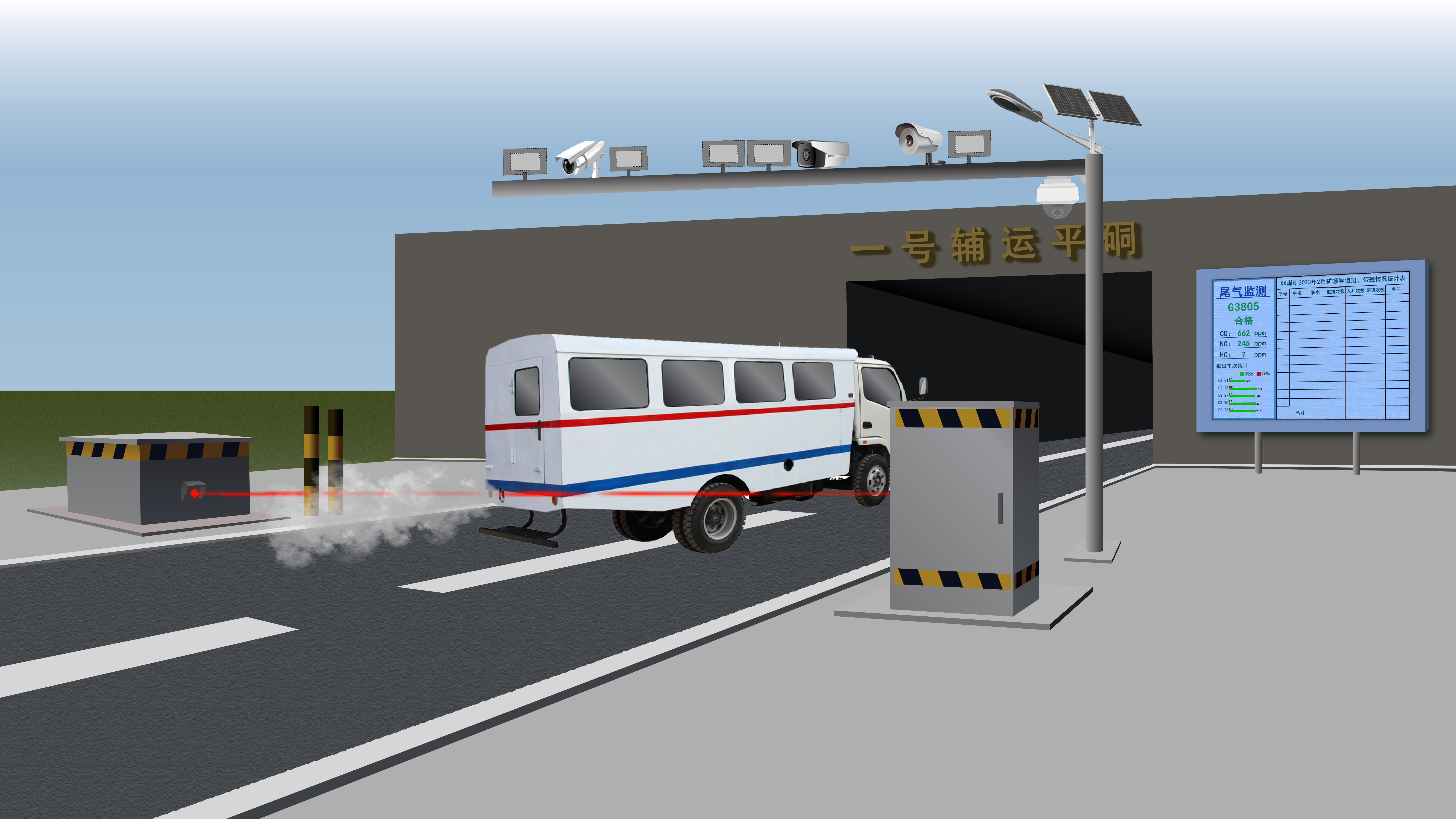 安装在井口附近,对入井车辆尾气排放进行快速监测,可实现不停车、无人值守的高排放车辆快速筛查,有效减少井下空气污染和工作者职业病危害,为实现“绿色矿山”“智能矿山”的发展目标赋能。